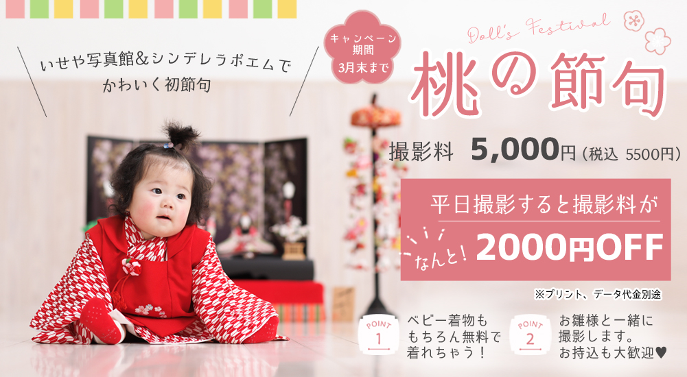 初節句キャンペーン【2022年3月末まで】【初節句キャンペーン】撮影料平日の撮影で 通常5,000円(税込 5,500円)が2,000円OFF!キャンペーン期間2022年3月末まで撮影のご予約はこちらから