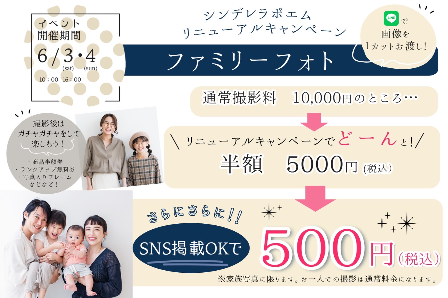 | 撮影内容 | ・撮影 ・衣装 ・着付、ヘアメイク ・オールデータ ・家族写真 |