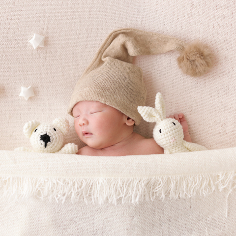 生後2週間までの赤ちゃんは、眠っている時間が長く、身体もやわらかいため、丸まった姿勢や新生児特有の柔らかく神秘的なポージングを撮影しやすい時期です。
