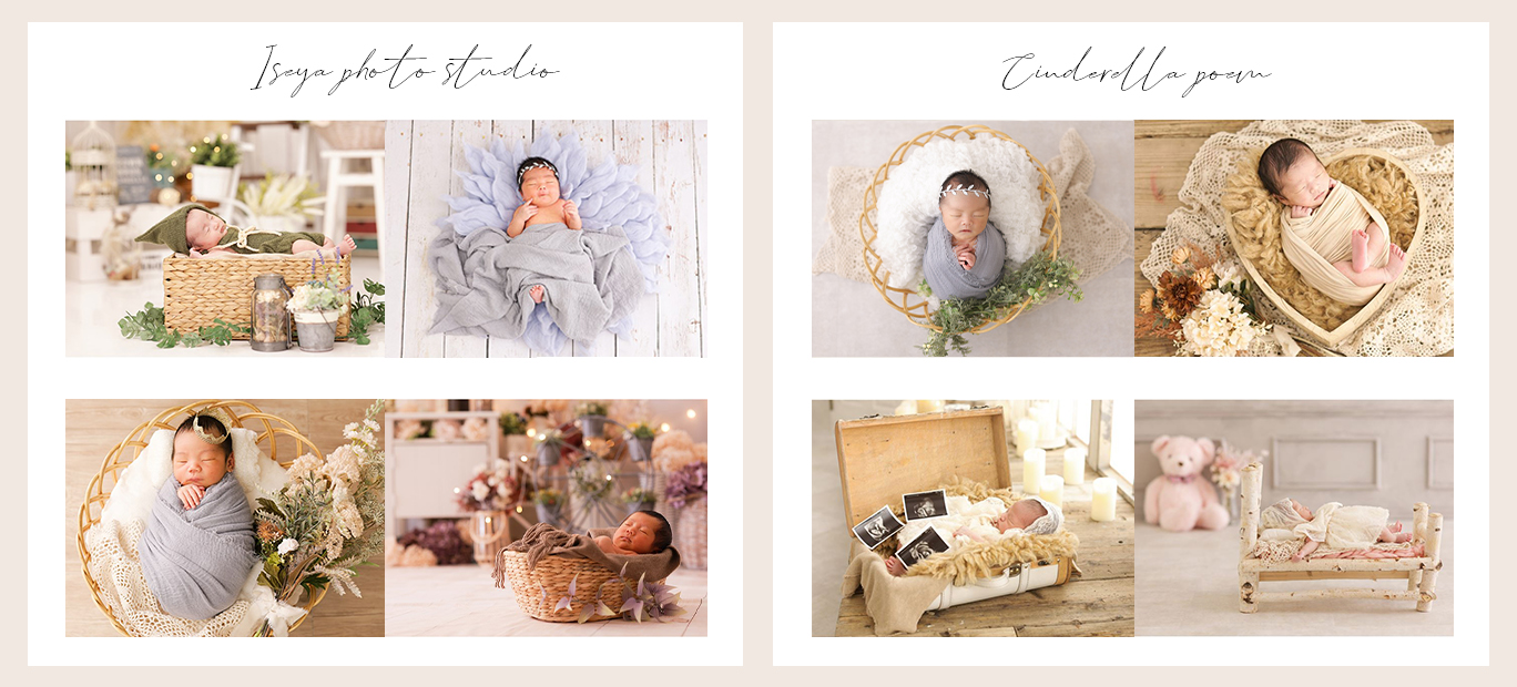 背景や小物をセットして、赤ちゃんを寝かせるだけ♪ 短時間&簡単にかわいい記念写真が撮れます。